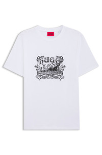 SIZE AND FIT The model wears a size M and is 6'2" tall with a, 35" chest, 28" waist and 35" hips. DETAILS Emblazoned with creative HUGO Menswear artwork, this T-shirt will breathe new life into your casuals. Straight fit. Soft cotton jersey. Regular fit Neckline: Crew neck Short sleeves Diwom - 50548565 QUALITY & CARE INSTRUCTIONS Material: 100% Cotton Do Not Dry Clean Machine Wash Cold Gentle Do Not Bleach Do Not Tumble Dry Iron Low Heat
