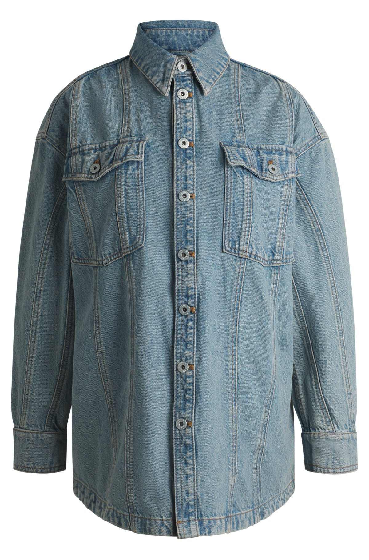 SIZE AND FIT The model wears a size S and is 5'8" tall with a, 31" chest, 23" waist and 34" hips. DETAILS Girvana_1_B - 50531715 A casual shirt with spiral seamlines and patch pockets, by HUGO Womenswear. This long-length design is crafted in rigid denim with a blue wash. Relaxed fit QUALITY & CARE INSTRUCTIONS Do Not Tumble Dry Machine Wash Cold Gentle Iron Medium Heat Quality: 100% Cotton (20% recycled) Do Not Bleach Do Not Dry Clean