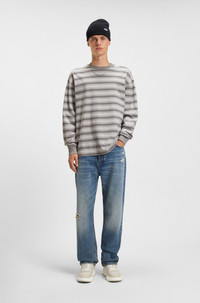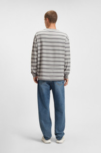 DETAILS Nisolog - 50548332 Featuring engineered horizontal stripes on soft cotton jersey, this HUGO Menswear T-shirt is a casual must. Loose fit. Special logo label on hem. loose fit Neckline: Crew neck Long sleeves Standard length QUALITY & CARE INSTRUCTIONS Do Not Tumble Dry Machine Wash Cold Gentle Quality: 100% Cotton Reduced Dry Clean Iron Low Heat Do Not Bleach