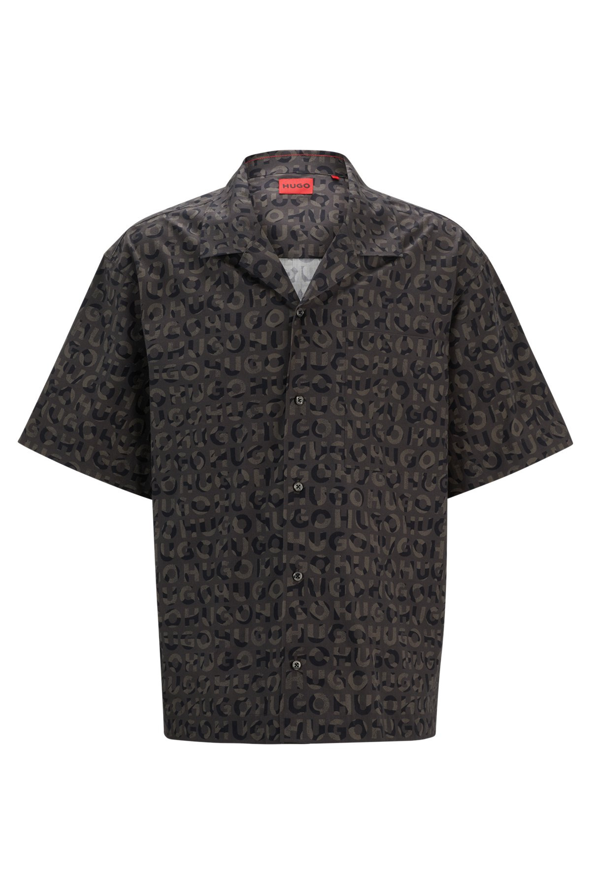 SIZE AND FIT The model wears a size M and is 6'2" tall with a, 35" chest, 27" waist and 35" hips. DETAILS Egeeno - 50519644 A statement shirt in an oversize fit by HUGO Menswear. Designed in breathable cotton poplin, this short-sleeved piece is printed with a seasonal motif. Oversized fit Reverse lapels Patch chest pockets Short length Fit back length: 74 cm (29 inches) QUALITY & CARE INSTRUCTIONS Do Not Bleach Do Not Tumble Dry Machine Wash Cold Quality: 100% Cotton Do Not Dry Clean Iron Low Heat