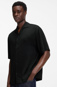 SIZE AND FIT The model wears a size M and is 6'2" tall with a, 35" chest, 27" waist and 35" hips. DETAILS Trimmed with a stacked logo, this HUGO Menswear shirt adds interest to casual looks. Oversize fit in fluid twill for everyday comfort. Oversized fit Reverse lapels Short length Fit back length: 72 cm (28 inches) Espino - 50560593 QUALITY & CARE INSTRUCTIONS Do Not Bleach Do Not Tumble Dry Hand Wash Only Material: 100% Lyocell Iron Low Heat Do Not Dry Clean