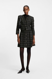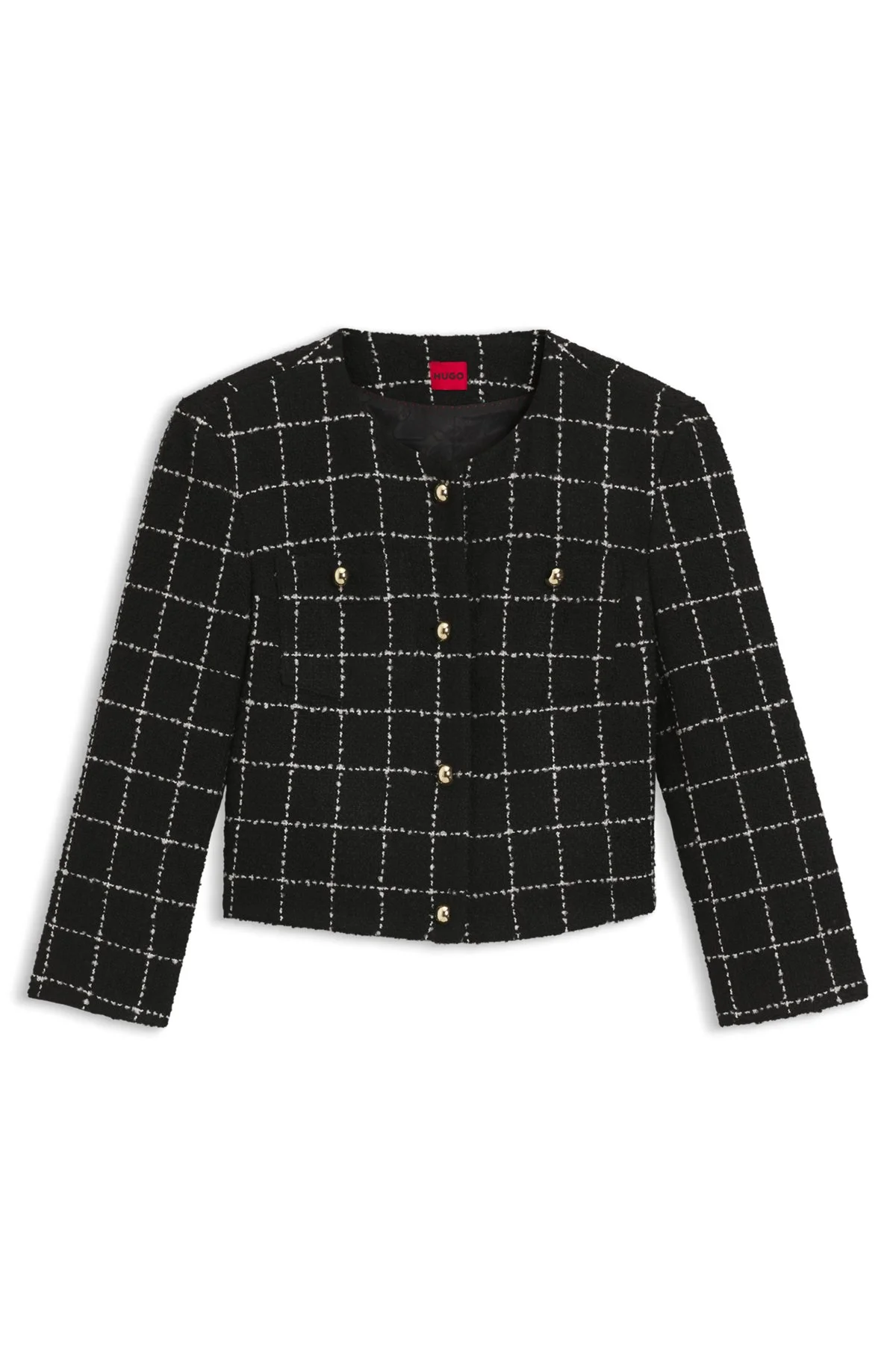 SIZE AND FIT The model wears a size 4 and is 5'8" tall with a, 31" chest, 23" waist and 34" hips. DETAILS Create chic formal looks with the check pattern and boucle yarn of this HUGO Womenswear jacket. Straight, cropped silhouette. Gold-tone buttons. Regular fit Fastening top: Button closure Number of buttons: 4 or more buttons Patch chest pockets No cuffs No vent Fully lined Cropped Fit back length: 46 cm (18 inches) Adini-1 - 50552962 QUALITY & CARE INSTRUCTIONS Do Not Bleach Do Not Wash Do Not Tumble Dry Material: 78% Polyacrylic, 17% Polyester, 1% Polyamid, 3% Viscose, 1% Cotton, Lining: 55% Polyester, 45% Viscose, Sleeve lining: 95% Polyester, 5% Elastane Do Not Iron Reduced Dry Clean