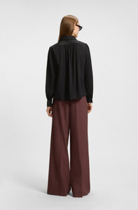SIZE AND FIT The model wears a size 4 and is 0'0" tall with a, 30" chest, 23" waist and 33" hips. DETAILS Estrella - 50543359 In a timeless regular fit, this HUGO Womenswear blouse adds modern energy to everyday looks. Tonal checkerboard jacquard fabric. Feminine tie neckline and gathered detailing. Regular fit Point collar Long sleeves Button cuffs Fit back length: 61 cm (24 inches) QUALITY & CARE INSTRUCTIONS Hand Wash Only Dry Clean Only Do Not Tumble Dry Iron Low Heat Do Not Bleach Quality: 56% Polyester, 44% Viscose