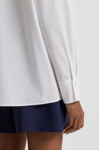 SIZE AND FIT The model wears a size 4 and is 5'8" tall with a, 31" chest, 23" waist and 34" hips. DETAILS Eryss - 50544327 Featuring a tie collar with an embroidered stacked logo, this HUGO Womenswear blouse is a chic everyday option. Straight fit in paper-touch cotton poplin. Regular fit Bow tie collar Long sleeves Button cuffs Fit back length: 70 cm (28 inches) QUALITY & CARE INSTRUCTIONS Quality: 100% Cotton Do Not Dry Clean Do Not Tumble Dry Machine Wash Cold Do Not Bleach Iron Low Heat