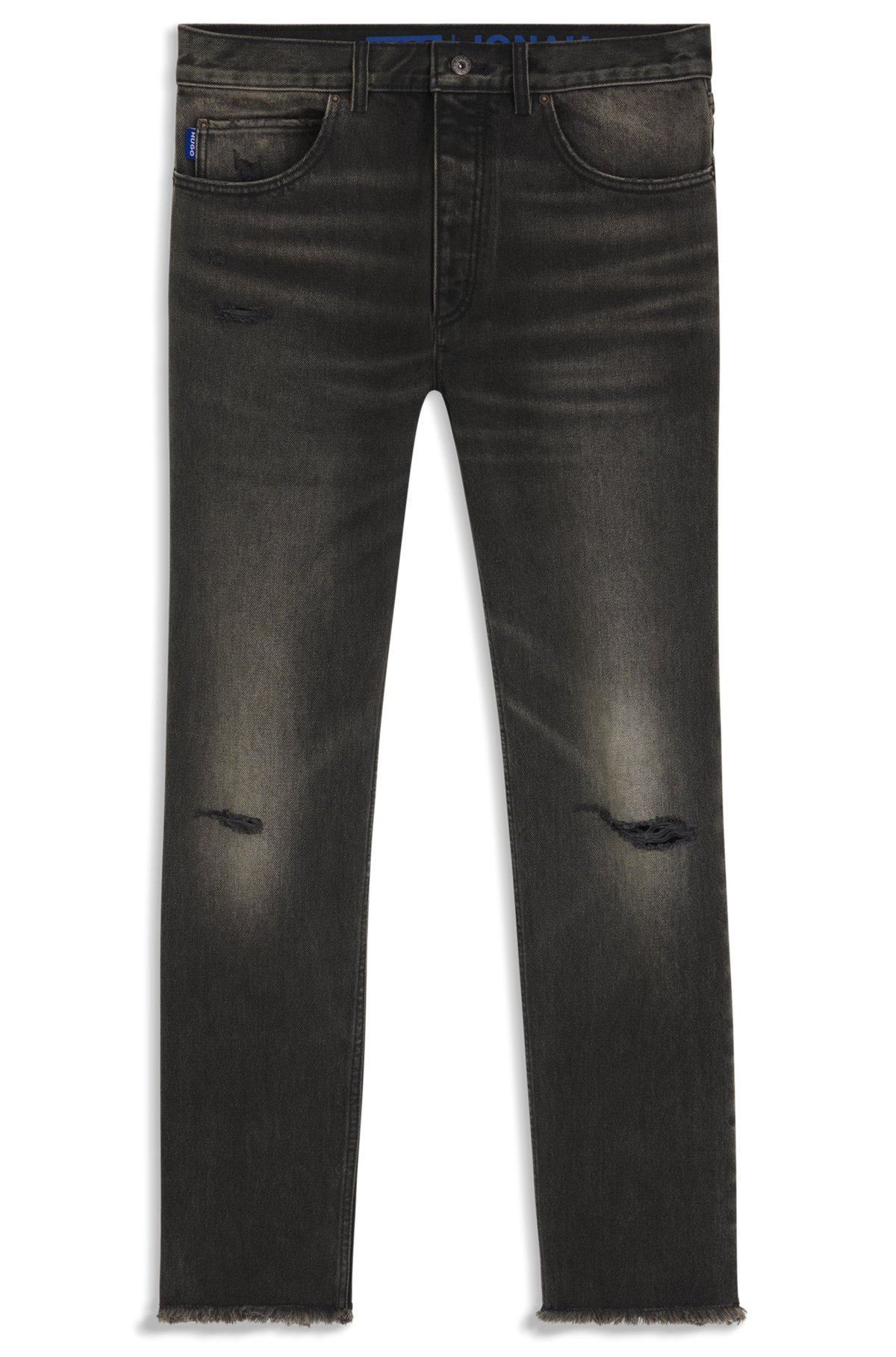 SIZE AND FIT The model wears a size 32/32 and is 6'1" tall with a, 36" chest, 28" waist and 36" hips. DETAILS Jonah - 50541593 In rigid denim with heavy distressing, these HUGO Menswear jeans are an authentic casual foundation. Versatile gray tone. Straight fit. Regular fit Regular rise Button closure Pockets bottom front: Side pockets Straight leg Pockets bottom back: Patch pocket Standard length Fit foot width: 40,0 cm (15.7 inches) QUALITY & CARE INSTRUCTIONS Do Not Bleach Do Not Tumble Dry Quality: 100% Cotton, pocketing: 100% Cotton Iron Medium Heat Do Not Dry Clean Machine Wash Cold Gentle