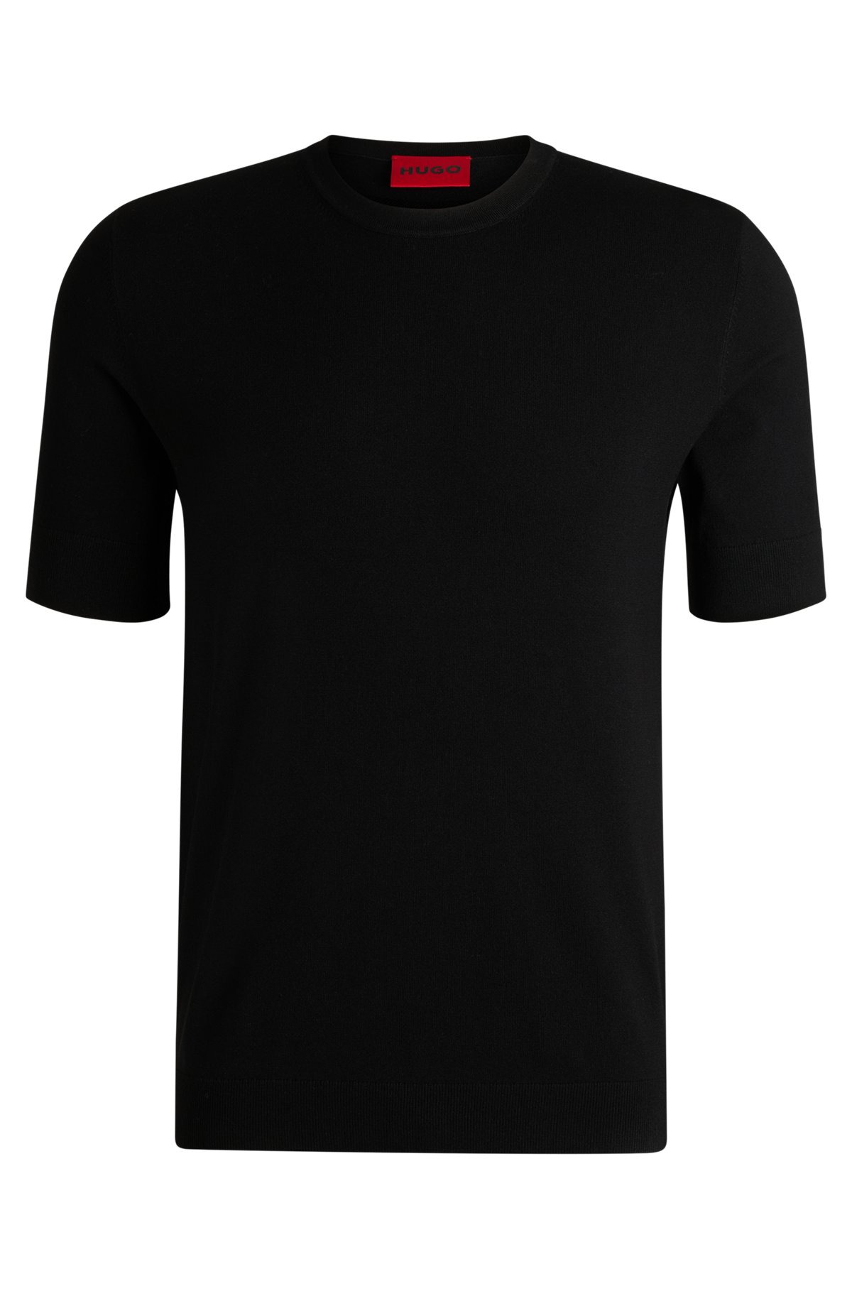 DETAILS San Carl-CV - 50536693 With a subtly embroidered logo at the rear neck, this regular-fit HUGO Menswear sweater is a modern layer. Knitted in breathable yarns. Short sleeves. Slim fit Neckline: Crew neck Short sleeves Standard length QUALITY & CARE INSTRUCTIONS Iron Low Heat Quality: 72% Viscose, 28% Polyester Machine Wash Cold Gentle Do Not Bleach Do Not Tumble Dry Do Not Dry Clean