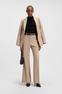 DETAILS Hasmina - 50545533 With a straight fit that widens through the leg, these HUGO Womenswear trousers are a modern formal foundation. Comfortable stretch fabric. Regular fit High rise Hook and zip closure Wide leg Crease Pockets bottom front: Side pockets Pockets bottom back: Welt pocket Fit foot width: 64,0 cm (25.2 inches) QUALITY & CARE INSTRUCTIONS Reduced Dry Clean Do Not Tumble Dry Iron Low Heat Do Not Bleach Quality: 64% Polyester, 31% Viscose, 5% Elastane Machine Wash Cold Gentle