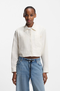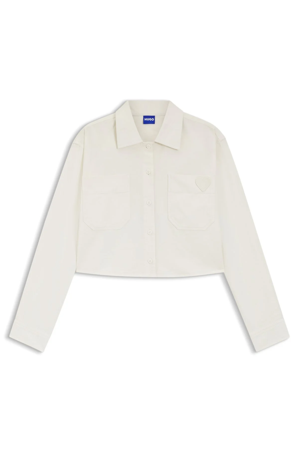 DETAILS Refresh your everyday collection with this cropped HUGO Womenswear blouse. Relaxed-fit T-shirt in super-soft cotton Embroidered Happy HUGO logo. Relaxed fit Point collar Long sleeves Button cuffs Patch chest pockets Edia_B - 50542967 QUALITY & CARE INSTRUCTIONS Machine Wash Cold Material: 100% Cotton Do Not Dry Clean Do Not Tumble Dry Iron Low Heat Do Not Bleach