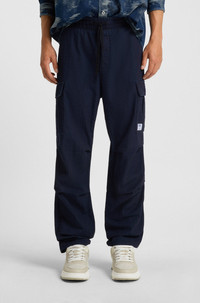 SIZE AND FIT The model wears a size M and is 6'2" tall with a, 35" chest, 27" waist and 35" hips. DETAILS Gadic242W - 50552121 In a relaxed fit with a straight leg, these HUGO Menswear cargo trousers provide a modern foundation. Denim-look ripstop. Made from 100% cotton. Relaxed fit Regular rise Elastic Waistband Straight leg Pockets bottom front: Side slash pockets Pockets bottom back: Flap pocket QUALITY & CARE INSTRUCTIONS Do Not Tumble Dry Machine Wash Cold Gentle Quality: 100% Cotton, pocketing: 65% Polyester, 35% Cotton Reduced Dry Clean Iron Low Heat Do Not Bleach