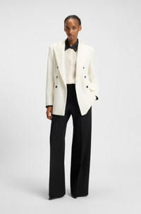 DETAILS Amalisa - 50544744 This modern HUGO Womenswear blazer embraces an oversize silhouette that will go with anything. Stretch twill with a fluid feel. Double-breasted closure. Subtle branding. Relaxed fit Peaked lapels Fastening top: Button closure Number of buttons: Double-breasted Welt chest pockets Pockets top: Flap pockets Functional button Back vent Fully lined Fit back length: 74 cm (29 inches) QUALITY & CARE INSTRUCTIONS Do Not Tumble Dry Do Not Bleach Reduced Dry Clean Do Not Wash Quality: 75% Polyester, 22% Viscose, 3% Elastane, Lining: 50% Viscose, 50% Polyester, Sleeve lining: 64% Viscose, 36% Polyester Iron Low Heat