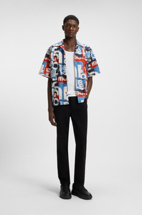 SIZE AND FIT The model wears a size M and is 6'2" tall with a, 31" chest, 26" waist and 35" hips. DETAILS Eligino - 50545226 Add impact to everyday looks with this HUGO Menswear shirt. Cut to a laid-back fit in soft cotton. Statement logos printed all over. Relaxed fit Reverse lapels Patch chest pockets Short length Fit back length: 71 cm (28 inches) QUALITY & CARE INSTRUCTIONS Do Not Tumble Dry Quality: 100% Cotton Iron Low Heat Do Not Bleach Machine Wash Cold Do Not Dry Clean