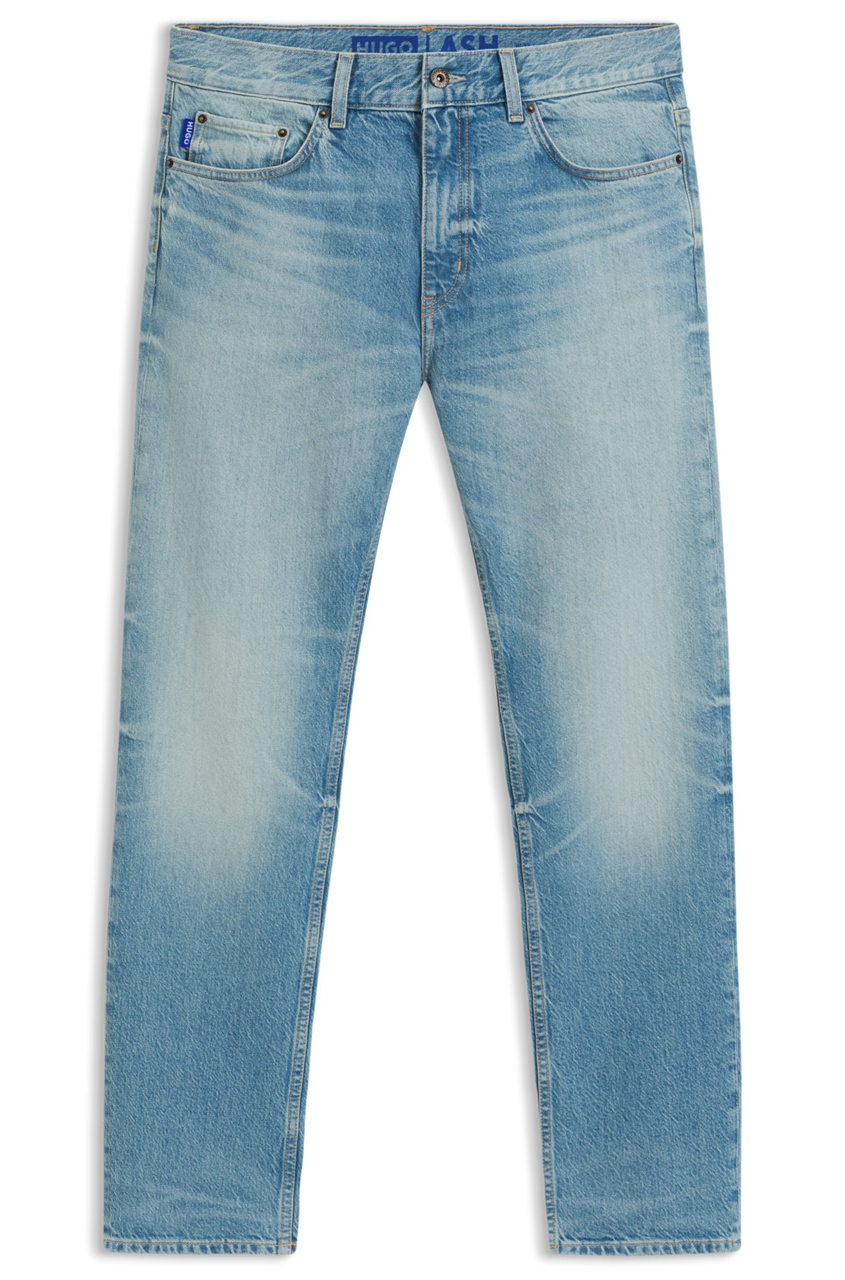SIZE AND FIT The model wears a size 32/32 and is 6'2" tall with a, 36" chest, 28" waist and 36" hips. DETAILS Ash - 50541567 Cut to a slim fit with a straight leg, these HUGO Menswear jeans have a characterful color outcome. Blue wash on green-cast denim. Slim fit Regular rise Button and zip closure Pockets bottom front: Side pockets Straight leg Pockets bottom back: Patch pocket Standard length Fit foot width: 36,0 cm (14.2 inches) QUALITY & CARE INSTRUCTIONS Iron Medium Heat Quality: 99% Cotton, 1% Elastane, pocketing: 100% Cotton Machine Wash Cold Gentle Do Not Dry Clean Do Not Tumble Dry Do Not Bleach