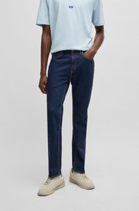 SIZE AND FIT The model wears a size 33/32 and is 6'2" tall with a, 31" chest, 26" waist and 35" hips. DETAILS Ash - 50529217 With stretch for lasting comfort, these dark-blue HUGO Menswear jeans have a slightly lived-in look. Defined fit with a straight leg. Slim fit Regular rise Button and zip closure Pockets bottom front: Side pockets Straight leg Pockets bottom back: Patch pocket Standard length Fit foot width: 36,0 cm (14.2 inches) QUALITY & CARE INSTRUCTIONS Quality: 99% Cotton, 1% Elastane, pocketing: 100% Cotton Iron Medium Heat Do Not Bleach Do Not Tumble Dry Machine Wash Cold Gentle Do Not Dry Clean