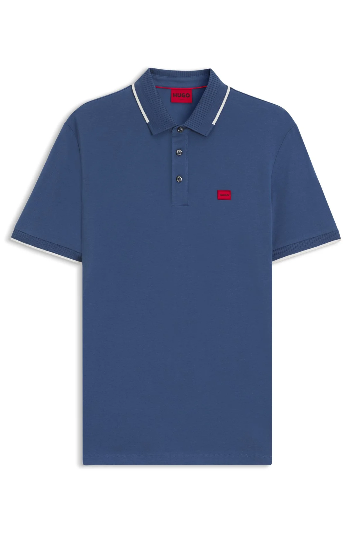 SIZE AND FIT The model wears a size M and is 6'0" tall with a, 33" chest, 27" waist and 35" hips. DETAILS Deresino232 - 50490775 A versatile polo shirt from HUGO Menswear, featuring contrast tipping and a ribbed structure at the collar. Made in breathable cotton pique. Sharp slim fit. Slim fit Neckline: Polo collar Short sleeves Ribbed cuffs QUALITY & CARE INSTRUCTIONS Do Not Tumble Dry Quality: 100% Cotton Do Not Bleach Machine Wash Cold Gentle Reduced Dry Clean Iron Low Heat