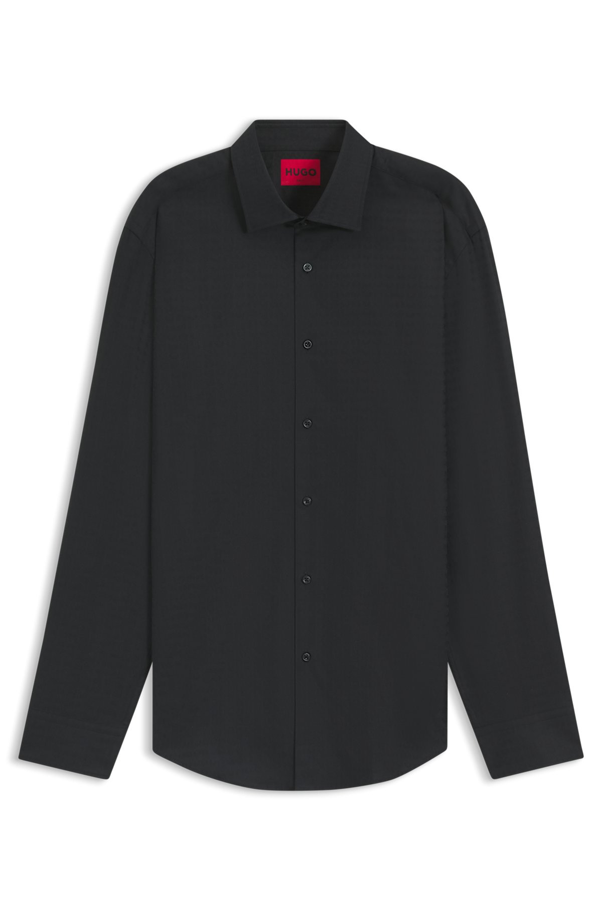SIZE AND FIT The model wears a size 15.7 and is 6'2" tall with a, 31" chest, 26" waist and 35" hips. DETAILS Kenno - 50544934 A classic piece with a creative twist, this slim-fitting HUGO Menswear shirt features an all-over logo jacquard. Crafted in soft, breathable cotton. Slim fit Kent collar Barrel cuffs Standard length QUALITY & CARE INSTRUCTIONS Iron Low Heat Do Not Bleach Machine Wash Cold Quality: 100% Cotton Do Not Tumble Dry Do Not Dry Clean