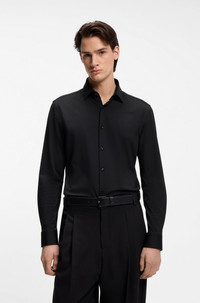 SIZE AND FIT The model wears a size 15.5 and is 6'2" tall with a, 31" chest, 26" waist and 35" hips. DETAILS Kenno - 50481195 A long-sleeved business shirt by HUGO Menswear. Crafted in performance-stretch jersey for advanced comfort, this wardrobe essential is tailored to a narrow fit for a clean profile. Signature red piping trims the inner collar to deliver typical HUGO edge. Slim fit Kentkragen Barrel cuffs Standard length QUALITY & CARE INSTRUCTIONS Iron Low Heat Do Not Tumble Dry Machine Wash Cold Gentle Do Not Dry Clean Do Not Bleach Quality: 90% Polyamid, 10% Elastane