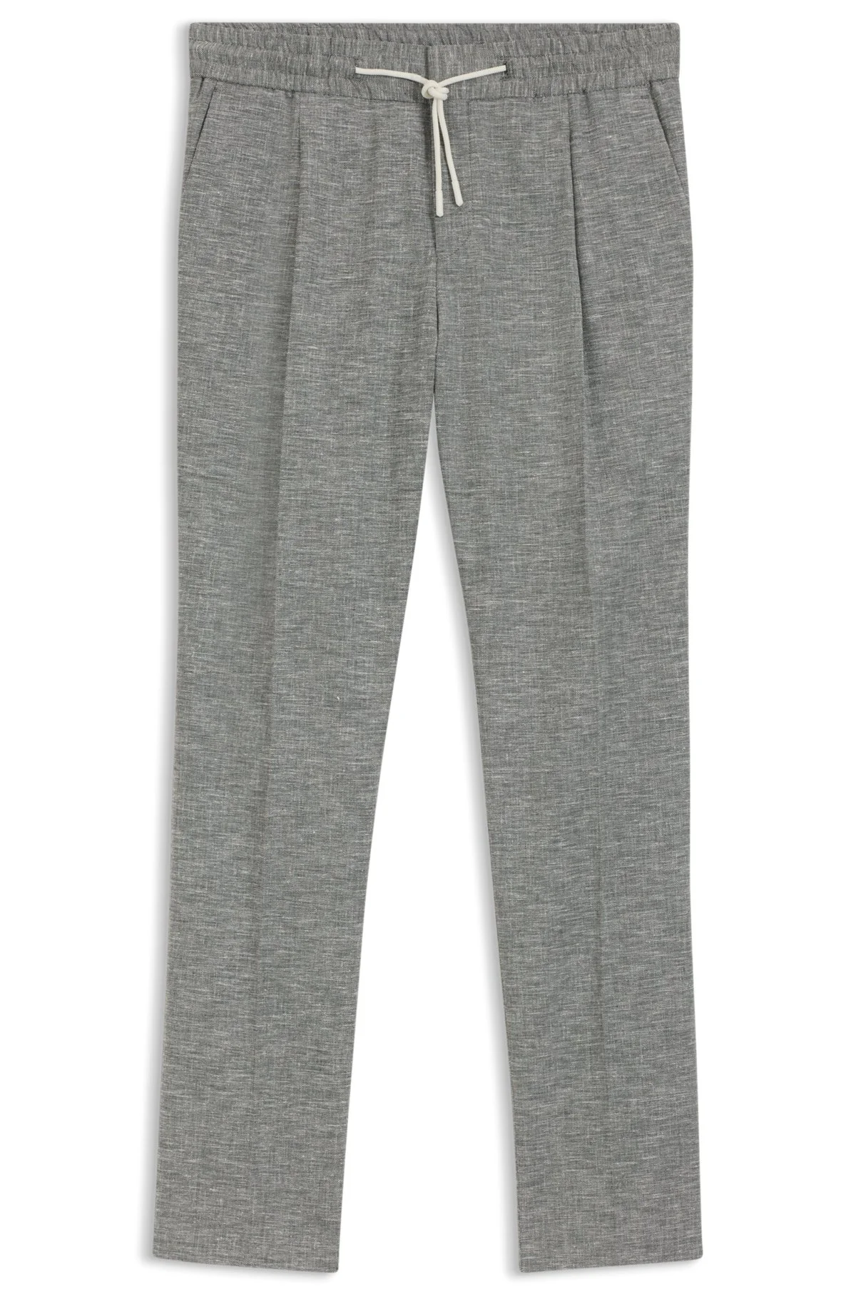 DETAILS Cut to a defined fit with a drawcord waist, these HUGO Menswear trousers are a modern update to classic sharkskin. With cotton, linen and stretch. Slim fit Fit foot width: 36,0 cm (14.2 inches) Getlin251F3 - 50559691 QUALITY & CARE INSTRUCTIONS Iron Low Heat Material: 32% Polyester, 29% Cotton, 20% Linen, 17% Viscose, 2% Elastane, pocketing: 65% Polyester, 35% Cotton Do Not Tumble Dry Reduced Dry Clean Do Not Bleach Do Not Wash