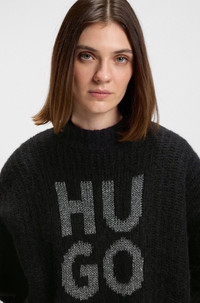 SIZE AND FIT The model wears a size S and is 5'10" tall with a, 31" chest, 23" waist and 35" hips. DETAILS This comfy, oversize HUGO Womenswear sweater adds impact to winter looks with its sparkling stacked-logo jacquard. Blended with cozy alpaca and warm wool. Oversized fit Neckline: Crew neck Long sleeves Sloguis - 50548245 QUALITY & CARE INSTRUCTIONS Reduced Dry Clean Material: 38% Wool, 30% Polyacrylic, 18% Alpaca, 13% Polyamid, 1% Elastane, Front panel: 50% Wool, 27% Polyacrylic, 11% Polyamid, 9% Viscose, 2% Metallizing, 1% Elastane Hand Wash Only Do Not Tumble Dry Iron Low Heat Do Not Bleach