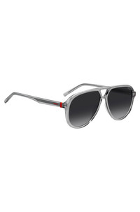 DETAILS HG 1362/SKB7599O - 58329344 With temple logos and coordinating rubber trims, these HUGO Womenswear sunglasses add fresh styling to your accessory collection. Feminine shape in transparent acetate. Double bridge. Front material: Injection molded Temple material: Injection molded Hinge type: Regular Lens: Shaded Lens material: Polyester Size lens: 2.32 in (59 mm) (0 inches) Size bridge: 0.47 in (12 mm) (0 inch.) Temple Length: 5.7 in (145 mm) (0 inches)