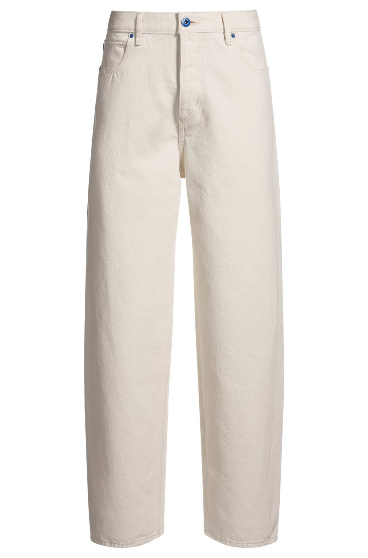 DETAILS carpenter/4 - 50541154 Featuring a carpenter pocket, these HUGO Menswear jeans are inspired by workwear styles. Ecru denim with a straight fit and double knee construction. Logo details. baggy fit Regular rise Button closure Pockets bottom front: Side pockets Straight leg Pockets bottom back: Patch pocket Standard length Fit foot width: 46,0 cm (18.1 inches) QUALITY & CARE INSTRUCTIONS Machine Wash Cold Gentle Iron Medium Heat Do Not Tumble Dry Do Not Bleach Do Not Dry Clean Quality: 100% Cotton, pocketing: 100% Cotton