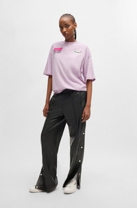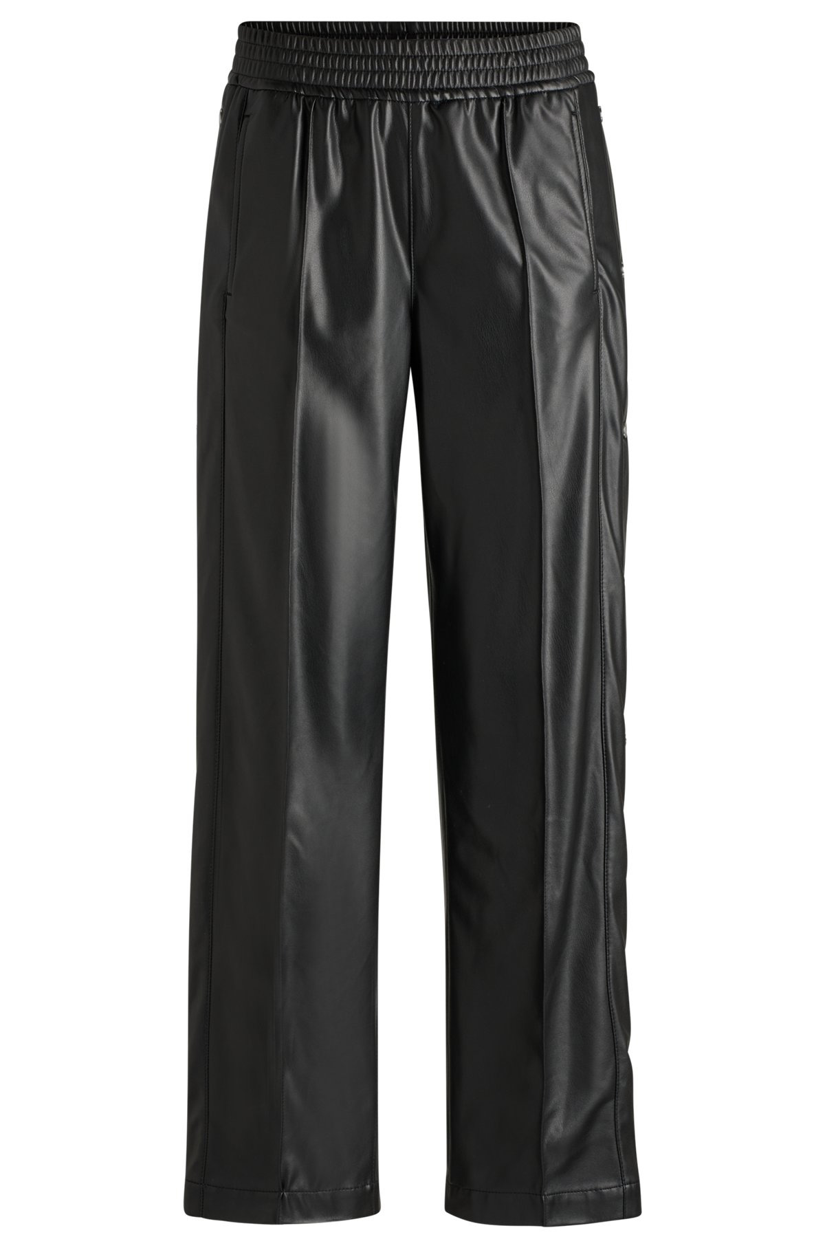 SIZE AND FIT The model wears a size 4 and is 5'8" tall with a, 31" chest, 23" waist and 34" hips. DETAILS Hileda-1_B - 50522349 Trend-driven trousers with press-studs on the side seams by HUGO. This pair is cut to a straight fit in synthetic coated fabric. Synthetic coated fabric, sometimes referred to as faux leather, is a fabric designed to resemble real leather, and/or display a matte, glossy, smooth, or textured, coated appearance. QUALITY & CARE INSTRUCTIONS Iron Low Heat Machine Wash Cold Gentle Reduced Dry Clean Do Not Bleach Quality: 60% Polyurethane, 40% Polyester, pocketing: 100% Polyester Do Not Tumble Dry