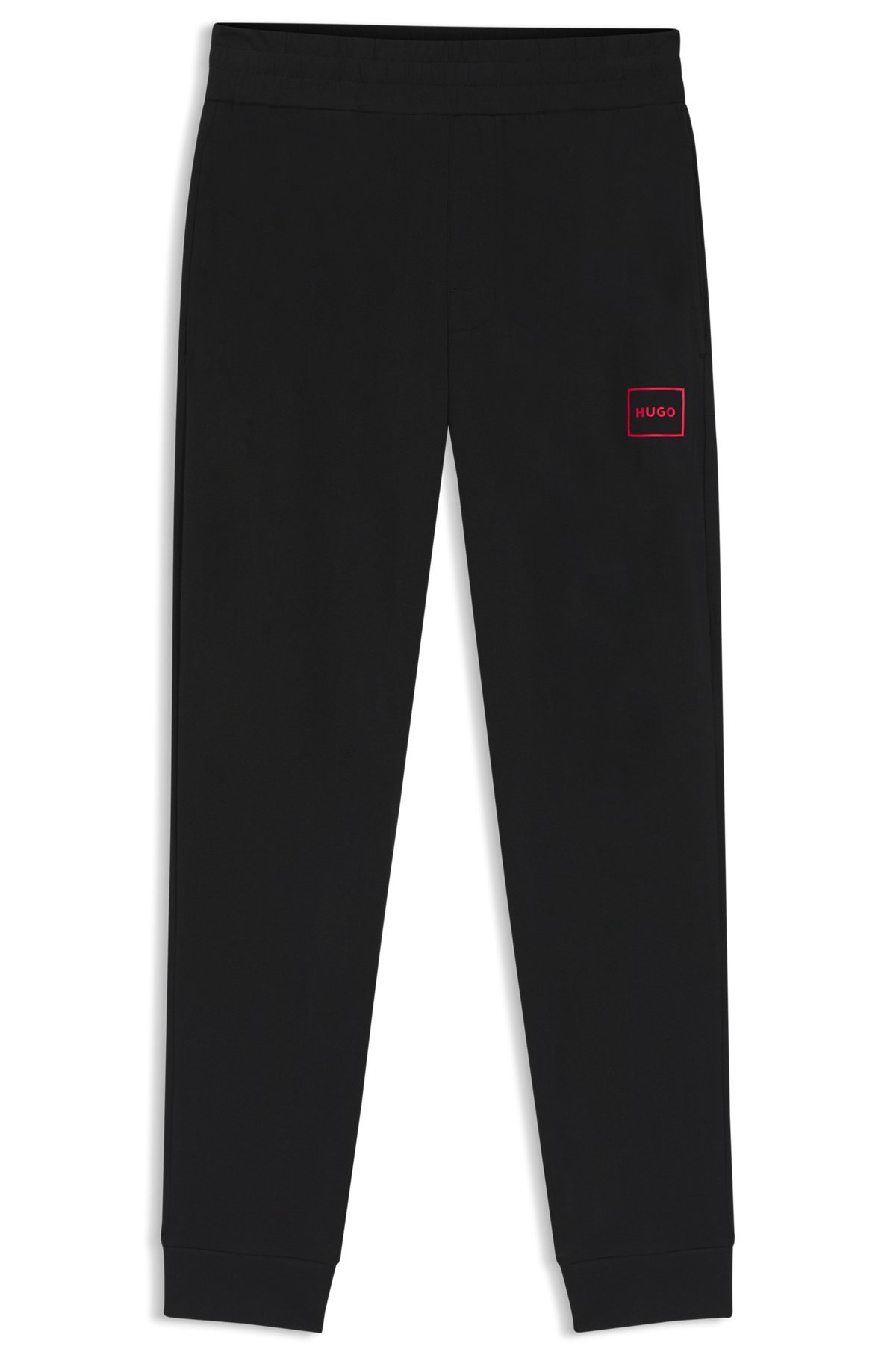 SIZE AND FIT The model wears a size M and is 6'3" tall with a, 35" chest, 31" waist and 35" hips. DETAILS Laze Pants CW - 50525246 Cuffed tracksuit bottoms with a logo print by HUGO. This regular-rise pair is crafted in stretch jersey for comfort. Covered waistband Drawstring Pockets bottom front: Side pockets QUALITY & CARE INSTRUCTIONS Quality: 95% Cotton, 5% Elastane Do Not Dry Clean Machine Wash Warm Do Not Bleach Tumble Dry Low Heat Iron Low Heat
