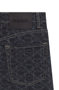 SIZE AND FIT The model wears a size 27/32 and is 5'9" tall with a, 29" chest, 23" waist and 34" hips. DETAILS 937_13 - 50541522 With their monogram laser print and super-wide leg, these high-waisted HUGO Womenswear jeans are an expressive casual option. Crafted in indigo denim. wide leg fit High rise Button and zip closure Pockets bottom front: Ticket pocket Wide leg Pockets bottom back: Patch pocket QUALITY & CARE INSTRUCTIONS Do Not Tumble Dry Do Not Dry Clean Do Not Bleach Iron Medium Heat Machine Wash Cold Gentle Quality: 100% Cotton, pocketing: 65% Polyester, 35% Cotton