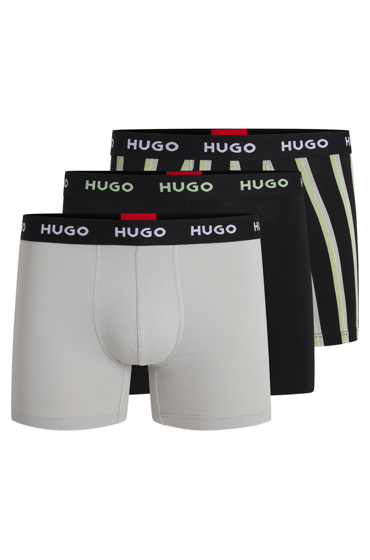 SIZE AND FIT The model wears a size M and is 6'1" tall with a, 32" chest, 27" waist and 33" hips. DETAILS BOXERBR TRPLT DESIGN - 50532559 Three pairs of regular-rise boxer briefs by HUGO Menswear. With plain and patterned designs, each stretch-cotton pair has repeat branding on the waistband. Exposed waistband Regular rise QUALITY & CARE INSTRUCTIONS Do Not Dry Clean Machine Wash Warm Quality: 95% Cotton, 5% Elastane, Waistband: 55% Polyamid, 33% Polyester, 12% Elastane Iron Low Heat Tumble Dry Low Heat Do Not Bleach