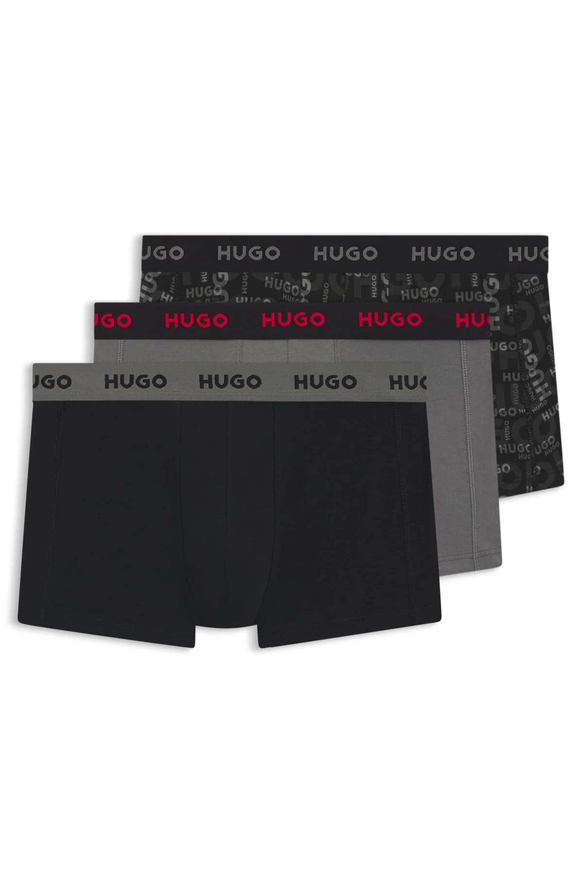 SIZE AND FIT The model wears a size M and is 6'2" tall with a, 36" chest, 28" waist and 36" hips. DETAILS With repeat-logo waistbands, this trio of HUGO Menswear trunks is cut in comfy stretch cotton for everyday comfort. Plain and printed designs. Packaging: Box Exposed waistband Regular rise TRUNK TRIPLET DESIGN - 50532550 QUALITY & CARE INSTRUCTIONS Material: 95% Cotton, 5% Elastane, Waistband: 55% Polyamid, 33% Polyester, 12% Elastane Machine Wash Warm Tumble Dry Low Heat Do Not Dry Clean Iron Low Heat Do Not Bleach