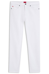 DETAILS Create fresh summer looks with the bright white of these HUGO Menswear jeans. Flexible stretch denim. Cut to a streamlined fit. Slim fit Regular rise Button and zip closure Pockets bottom front: Side pockets Straight leg Pockets bottom back: Patch pocket Standard length Fit foot width: 36,0 cm (14.2 inches) HUGO 708 - 50556632 QUALITY & CARE INSTRUCTIONS Do Not Dry Clean Do Not Tumble Dry Iron Medium Heat Do Not Bleach Machine Wash Cold Gentle Material: 99% Cotton, 1% Elastane, pocketing: 100% Cotton