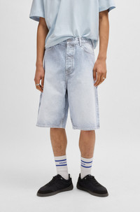 SIZE AND FIT The model wears a size 32 and is 6'1" tall with a, 33" chest, 25" waist and 35" hips. DETAILS Aman - 50534609 Designed in heavily washed blue denim, these HUGO Menswear striped shorts are a casual essential. Wide leg. Hammer loop and carpenter pockets. Logo details. loose baggy fit Mid rise Wide leg Pockets bottom front: Side pockets Pockets bottom back: Patch pocket QUALITY & CARE INSTRUCTIONS Quality: 100% Cotton, pocketing: 100% Cotton Iron Medium Heat Do Not Bleach Do Not Tumble Dry Machine Wash Cold Gentle Do Not Dry Clean