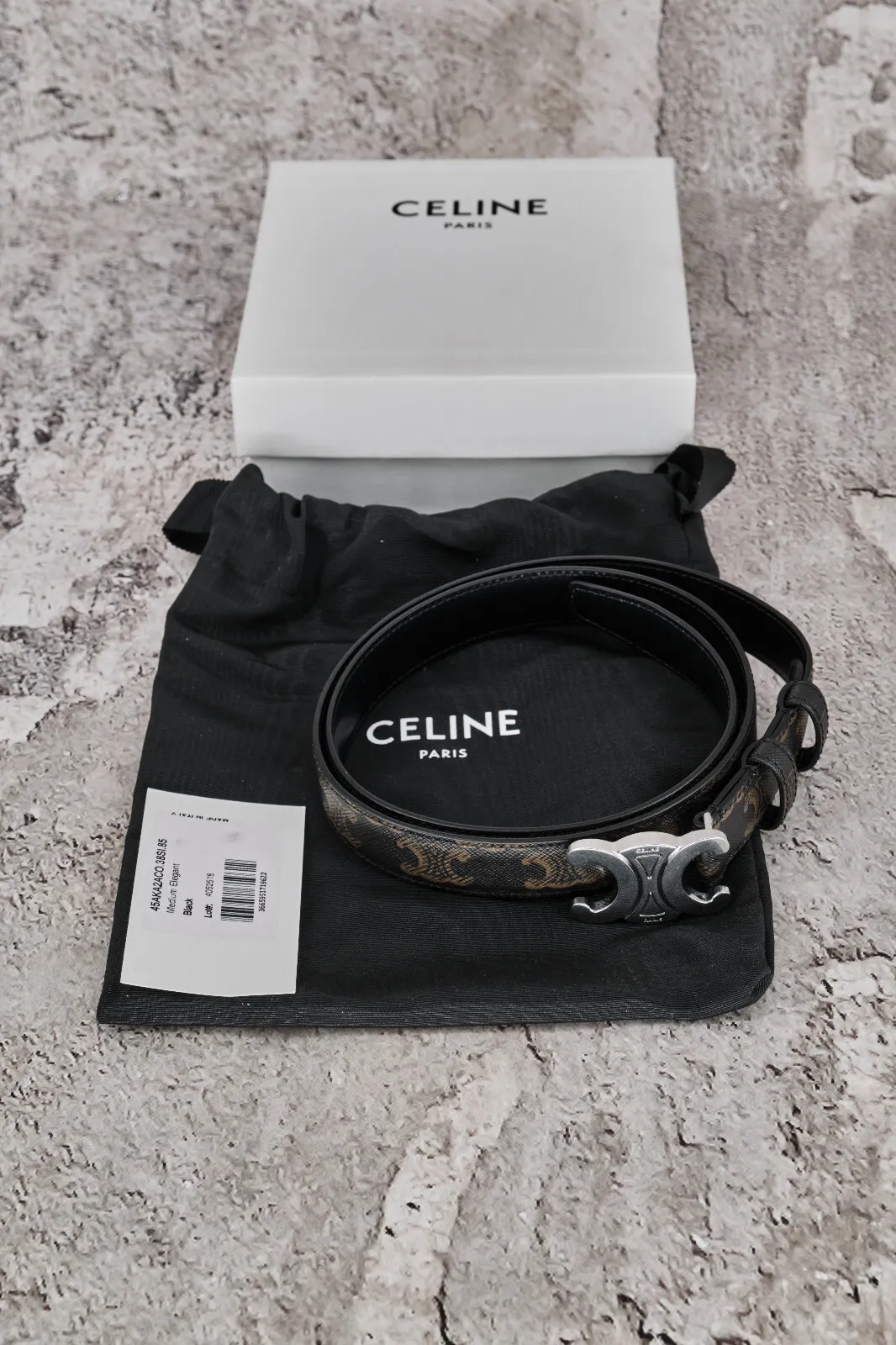 Brand New In Box Celine Medium Black Triomphe Belt in Triomphe Canvas Featuring silver finishing,buckle with collar stud and triomphe canvas Size: 85 (for sz 28 in Celine jeans) Composition: 65%PV , 32% CO , 3% PU , Leather Trimming Reference Number: 45AKA2ACO.38SI Width : 1 in (2.5 cm) Buckle with collar stud Made in Italy Retail: 650$ ▶️All items ship next business day after a clear payment. ▶️Free Shipping Worldwide With Tracking Number On All Orders.Express Shipping is available upon request.Telephone number is required. ▶️I always mark the parcels as "gift" with a low value. ▶️All items are Brand New / Never Worn and 100% authentic. I was a member of SZ and SuFu since 2008. ▶️NO TRADES.No Returns ,Reserves or Exchanges Accepted.