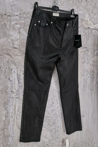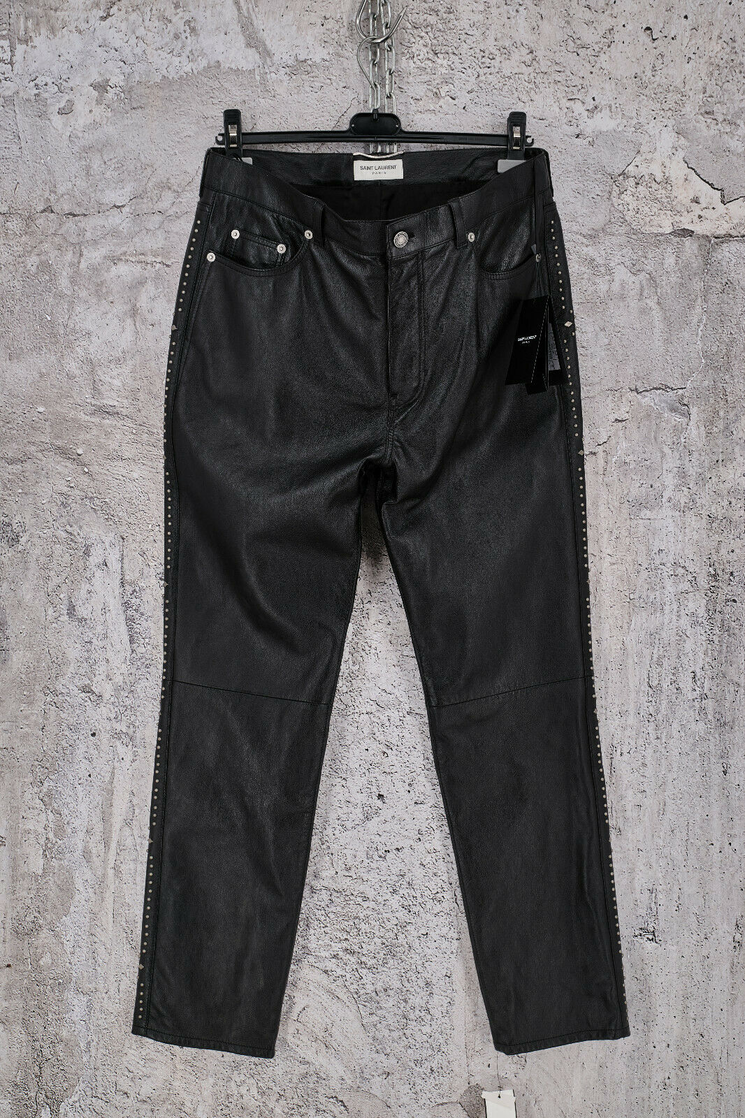 Brand New With Tags Saint Laurent Paris Slim Fit Studded Leather Pants . Featuring embellished studs at the sides with burnished silver, 5 pockets ,zip & button closure. Fully lined. Size: 50IT Color: Black Composition: 100% Lamb Leather . Lining: 59% Cupro - 41% Cotton. Reference Code: JP53 2019 00888 Made in Italy Retail: 3790$ Measurements Waist: 45.5cm Inseam: 70.5cm Hem Width: 16.5cm Thigh next to the crotch: 27cm Front Rise: 29.5cm ▶️All items ship next business day after a clear payment. ▶️Free Shipping Worldwide With Tracking Number On All Orders.Express Shipping is available upon request.Telephone number is required. ▶️I always mark the parcels as "gift" with a low value. ▶️All items are Brand New / Never Worn and 100% authentic. I was a member of SZ and SuFu since 2008. ▶️NO TRADES.No Returns ,Reserves or Exchanges Accepted.