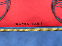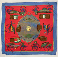 HERMES SILK SCARF LES VOITURES A TRANSFORMATION SCARF NECKERCHIEF This gorgeous and vintage inspired Hermes ‘Les Voitures à Transformation’ silk scarf was designed by Francoise de la Perriere and is sure to become an instant favourite for Hermès collectors everywhere. The lively print features a variety of carriages and buggies for the vintage enthusiast. This Hermès illustration was originally designed by Francoise de La Perriere in 1965 and only reissued five times after that. Perfect for any rider or lover of things equine. A scarf which allows you to tie it multiple ways and get different looks! You can wear it as a scarf, a head wrap, or a purse accessory! Tag : Hermes Measurement (approx.) : - Width : 35 inches - Length : 34 inches Color : Red / Blue Condition : Used 9/10 - Some stains PAYMENT & SHIPPING • Accept Paypal ONLY • Please leave your phone number on the note while make a purchase. • This item will be ship along with Tracking Number after received a completed payment. • Shipping Method : DHL Express, ETA within 7 working days. Dear Valued Customer : • Please do not expect the item in mint condition unless stated. It’s because vintage and used items may have sign of wear. • Don’t worry about Custom tax fees during Shipping because I always declared all items as a Gift and wrote the value lower than original price usually $10 only • Please don't hesitate to contact me if you have any inquiries ATTENTION • Please pay close attention to the measurement provided. • Do not rely on tag size as pre-worn items may have been altered, stretched or shrunk & vintage sizes do not directly translate the current sizes. • The best way to ensure a correct fit is to compare our measurements with the measurement of a similar items that you know fits yours well. • Please enlarge the photos for clearer image. Please read the descriptions and see the pictures carefully! Don’t forget to check out and follow my shop so that you won’t miss out more and any new great stuff and great deals. Thank you. 👌🏻