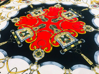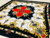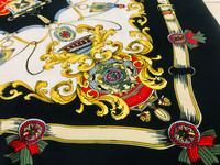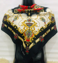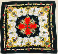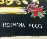LUXURY DESIGN HERMANA PUCCI SILK SCARF NECKERCHIEF BANDANA Luxury design Hermana Pucci scarf in gold and red pattern luxury theme with cream and black background. Tag : Hermana Pucci Measurement (approx.) : - Width : 34” - Length : 32” Color : Black Condition : Gently Used 9/10 PAYMENT & SHIPPING • Accept Paypal ONLY • Please leave your phone number on the note while make a purchase. • This item will be ship along with Tracking Number after received a completed payment. • Shipping Method : FedEx International Shipping, ETA within 7 working days. Dear Valued Customer : • Please do not expect the item in mint condition unless stated. It’s because vintage and used items may have sign of wear. • Don’t worry about Custom tax fees during Shipping because I always declared all items as a Gift and wrote the value lower than original price usually $10 only • Please don't hesitate to contact me if you have any inquiries ATTENTION • Please pay close attention to the measurement provided. • Do not rely on tag size as pre-worn items may have been altered, stretched or shrunk & vintage sizes do not directly translate the current sizes. • The best way to ensure a correct fit is to compare our measurements with the measurement of a similar items that you know fits yours well. • Please enlarge the photos for clearer image. Please read the descriptions and see the pictures carefully! Don’t forget to check out my store for more great stuff. Thank you.
