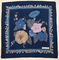 CHRISTIAN DIOR FLOWER PATTERN SCARF / NECKERCHIEF Attractive floral pattern Christian Dior scarf. Very beautiful blue scarf with purple, blue and beige color morning glory flower design. A scarf which allows you to tie it multiple ways and get different looks! You can wear it as a scarf, a head wrap, or a purse accessory! Tag : Christian Dior Measurement (approx.) : - Width : 30 inches - Length : 30.5 inches Color : Blue Condition : Gently Used 9/10 PAYMENT & SHIPPING • Accept Paypal ONLY • Please leave your phone number on the note while make a purchase. • This item will be ship along with Tracking Number after received a completed payment. • Shipping Method : FedEx International Shipping, ETA within 7 working days. Dear Valued Customer : • Please do not expect the item in mint condition unless stated. It’s because vintage and used items may have sign of wear. • Don’t worry about Custom tax fees during Shipping because I always declared all items as a Gift and wrote the value lower than original price usually $10 only • Please don't hesitate to contact me if you have any inquiries ATTENTION • Please pay close attention to the measurement provided. • Do not rely on tag size as pre-worn items may have been altered, stretched or shrunk & vintage sizes do not directly translate the current sizes. • The best way to ensure a correct fit is to compare our measurements with the measurement of a similar items that you know fits yours well. • Please enlarge the photos for clearer image. Please read the descriptions and see the pictures carefully! Don’t forget to check out and follow my shop so that you won’t miss out more and any new great stuff and great deals. Thank you. 👌🏻