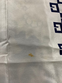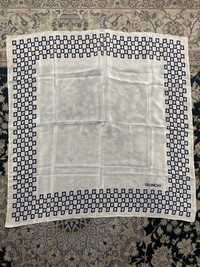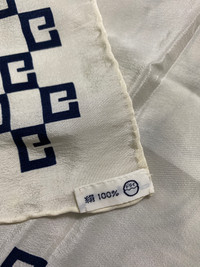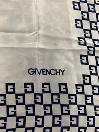 Vintage Givenchy Silk Scarf - Geometric Pattern with Logo This elegant vintage Givenchy silk scarf features a minimalist yet striking geometric pattern. The navy blue and white design is composed of interlocking “G” shapes, creating a modern and sophisticated look. The scarf is branded with “GIVENCHY” in a simple yet bold font, adding to its luxury appeal. Made from 100% silk, the scarf offers a soft, smooth texture that can be worn as an accessory to elevate your fashion ensemble. Despite a minor stain (as seen in the image), this piece remains a chic addition to any wardrobe. Perfect for those who appreciate high fashion and timeless accessories. • Brand: Givenchy • Material: 100% Silk • Design: Geometric pattern with Givenchy branding • Condition: Pre-owned, with some minor staining visible (refer to images). The stain does not detract from the overall beauty of the piece, but potential buyers should be aware. • Signature: “GIVENCHY” printed on the lower edge. • Care: Dry clean only (as indicated on the tag). • Givenchy silk scarf • Luxury Givenchy scarf • Geometric silk scarf • Designer scarves • Givenchy accessories • Silk fashion scarf • Vintage silk scarves • Givenchy logo scarf