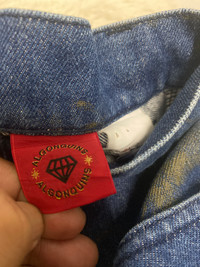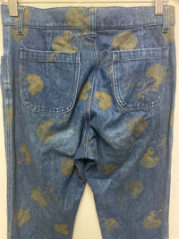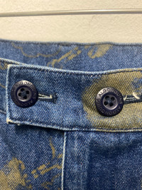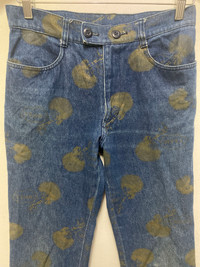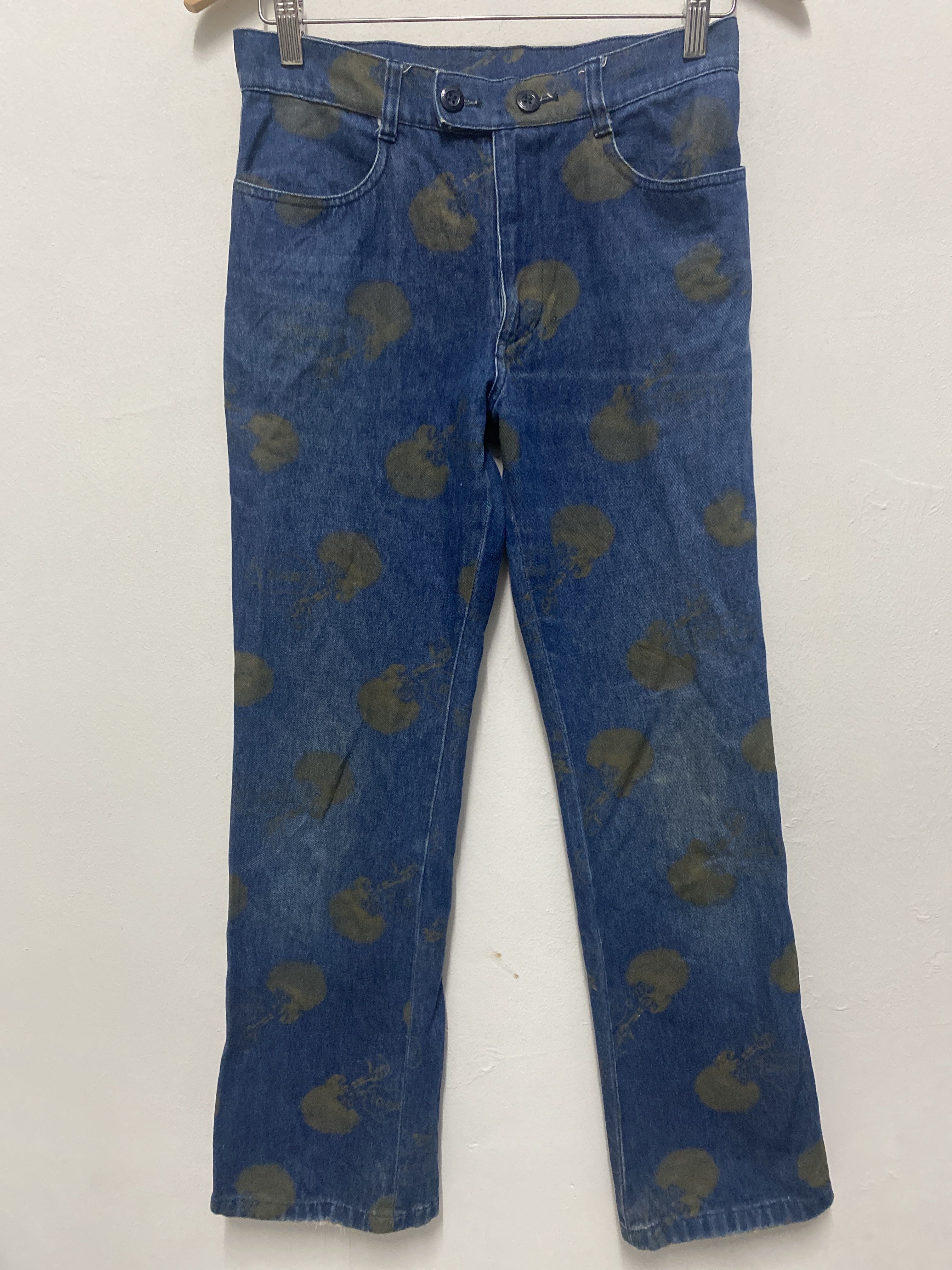 Algonquins All-Over Jellyfish Print Denim Pants – Rare Gothic Japanese Streetwear Algonquins is a cult Japanese brand that emerged in the 1980s and became a key player in the Visual Kei and Gothic Lolita fashion movements. Known for dark, whimsical designs and a rebellious spirit, Algonquins gained popularity among J-rock fans and alternative youth in Harajuku. These jeans reflect the brand’s unique fusion of gothic and punk aesthetics, with bold prints and custom details. These rare Algonquins denim pants feature a full-body jellyfish motif printed in olive green across indigo blue denim. Designed with a high-waist, double-button closure and minimalist 5-pocket construction, the pants offer both visual impact and subcultural authenticity. The back features classic patch pockets, and branding details include Algonquins buttons and the signature red tag with a diamond logo—an icon of Harajuku’s golden era. • Brand: Algonquins • Size: A (check measurement for accuracy) Manual waist size: 28 Outseam: 37” Inseam: 28” Open leg: 8” Front rise: 10” Thigh:10” Knee:7.5” • Features: Jellyfish all-over print, double-button waistband, patch pockets • Style: Gothic Punk / Visual Kei / Japanese Streetwear • Material: 100% cotton denim • Condition: Excellent vintage condition algonquins jellyfish jeans, japanese gothic punk denim, visual kei fashion pants, rare algonquins jeans, harajuku jellyfish print, gothic lolita streetwear, algonquins visual kei pants, vintage japan designer jeans #Algonquins #VisualKei #JapaneseStreetwear #HarajukuFashion #GothicPunk #RareDenim #JellyfishJeans #VintageJapan #AltFashion #AlgonquinsJapan