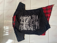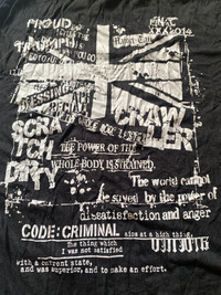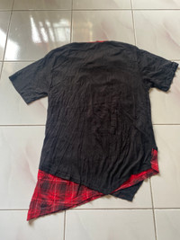 Beaumere Punk Graphic Layered T-Shirt with Red Flannel Hem – Union Jack Print Beaumere is a Japanese underground fashion brand known for rebellious, punk, and visual-kei inspired clothing. Their pieces often feature distressed designs, asymmetrical cuts, and bold English text reflecting themes of anti-establishment, self-expression, and emotional turmoil. This particular tee is a standout example, combining punk rock aesthetics with a grunge flannel layer and anarchic typography – a nod to both British punk and Japanese avant-garde streetwear. This Beaumere short sleeve t-shirt showcases a striking black-and-white distressed Union Jack graphic layered with chaotic, glitch-style text like “CRAWLER”, “CODE:CRIMINAL”, and phrases expressing anger and dissatisfaction with society. A standout feature is the faux-layered look, created with a sewn-in asymmetrical red tartan plaid flannel insert that extends from the hem and sleeves—channeling unmistakable punk energy. This piece is cut for a relaxed fit and is crafted from soft cotton for everyday rebellion. Chest: 17” Length:28” Beaumere punk t-shirt, Japanese punk fashion, layered flannel tee, Union Jack punk shirt, Beaumere Tokyo clothing, visual kei style, grunge plaid t-shirt, asymmetric hem tee, rebellious graphic shirt, rare Japanese streetwear #Beaumere #PunkFashion #JapaneseStreetwear #VisualKei #GrungeStyle #LayeredLook #TartanFlannel #UnionJack #CodeCriminal #UndergroundFashion