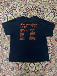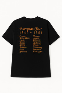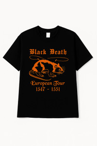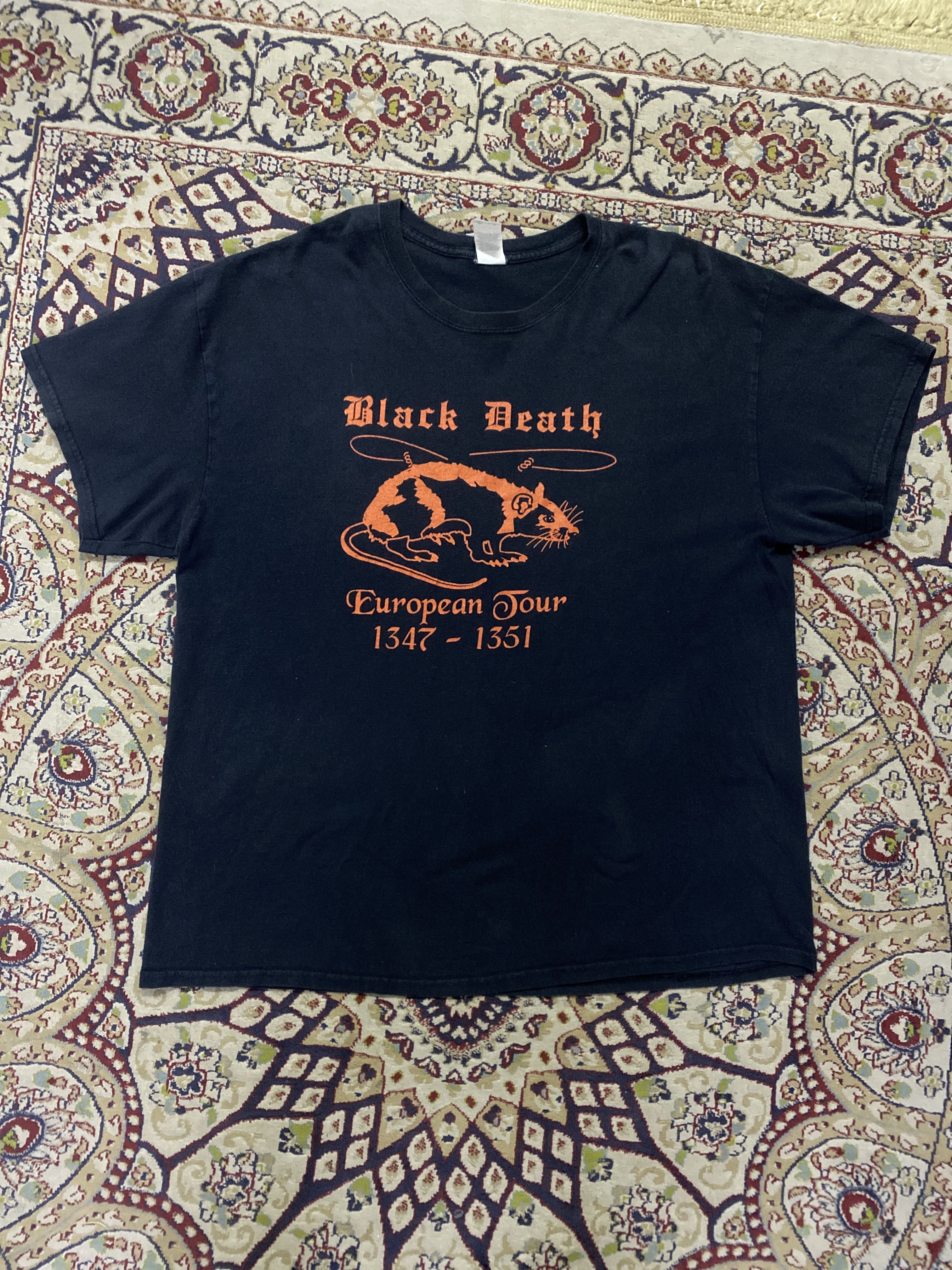 Black Death European Tour 1347–1351 T-Shirt – Plague Rat Graphic Tee Gildan XL – Medieval History Parody Shirt This shirt is a clever parody that blends dark humor with medieval history. It references the Black Death, a deadly pandemic that swept across Europe between 1347 and 1351, killing millions. The graphic features a plague-carrying rat and cities listed on the back like a band’s tour stops – turning one of history’s deadliest events into a “European Tour” joke. Popular among fans of vintage, goth, dark humor, and historical references. • Brand: Gildan Heavy Cotton • Size: XL • Color: Black with orange print • Material: 100% Cotton • Made in: Dominican Republic • Fit: Classic fit • Front Graphic: “Black Death European Tour 1347–1351” with plague rat • Back Graphic: List of historical plague-affected cities • Condition: Pre-owned in good vintage condition. No major flaws, holes or stains. Minor wear consistent with age. • Style Vibe: Dark humor, medieval aesthetic, vintage concert-style tee. • Black Death t-shirt • Plague rat graphic tee • European tour parody shirt • Medieval history t-shirt • Gothic humor tee • Dark humor shirt • Gildan vintage tee • Band tour style shirt • 1347 1351 plague tee • Historical graphic t-shirt • Vintage XL graphic tee #BlackDeathTee #PlagueRat #VintageGraphicTee #DarkHumorFashion #HistoricalParody #GothicStyle #MedievalAesthetic #EuropeanTourShirt #GildanVintage #grailedfinds