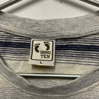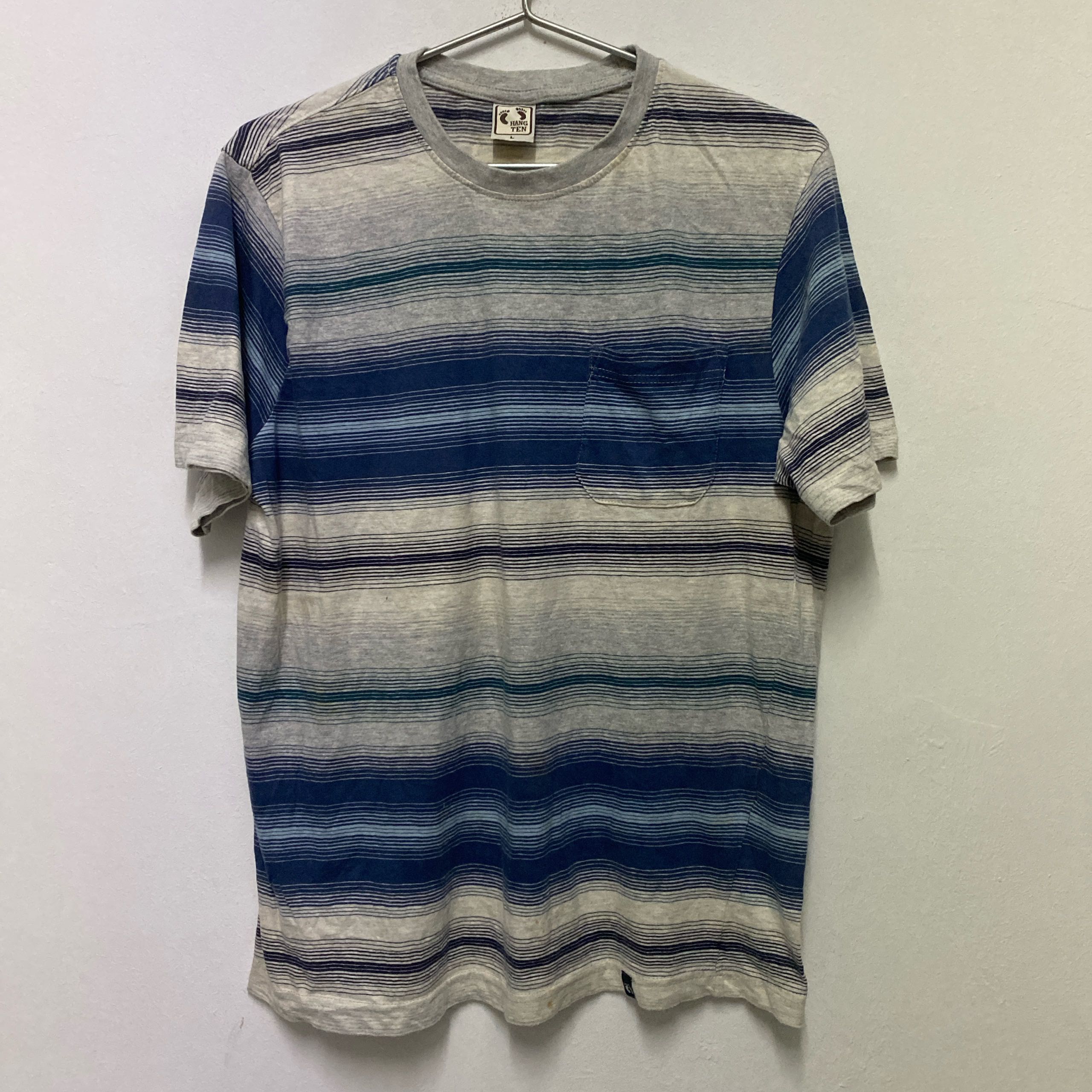 Hang Ten Gray and blue striped t-shirt with a pocket on the chest Chest: 21” Length: 26” A little yellow stain #stripes
