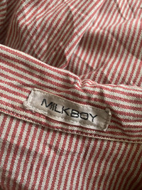 Milkboy Tokyo Workpunk 181 Coverall Jumpsuit Red White Striped Vintage Rare Rare and unique Milkboy Tokyo Workpunk 181 coverall jumpsuit in red and white stripes. Features a punk-inspired patch on the chest, contrast buttoned pockets, and a belted waist for an adjustable fit. The back has a distinctive two-tone design with a cream-colored lower panel. A collectible piece for Milkboy and Japanese streetwear enthusiasts. Milkboy Tokyo is a Japanese fashion brand known for its punk, gothic, and avant-garde designs. The “Workpunk” line blends industrial and workwear aesthetics with a rebellious punk edge, making it sought after among collectors and vintage fashion lovers. Milkboy Tokyo, Workpunk 181, Vintage Jumpsuit, Coverall, Japanese Streetwear, Rare Fashion, Red White Striped, Punk Workwear, Avant-Garde, Designer Jumpsuit