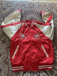 Vintage Sukajan Souvenir Jacket Japan Yokosuka Dragon Phoenix Embroidered Red White Vintage Japanese Sukajan Souvenir Jacket Design: Embroidered Dragon & Phoenix Color: Red & White Size: (Specify if known) Material: Likely Satin (Confirm with touch & feel) Condition: • Good vintage condition with signs of wear • Some repaired stitching and minor damage on the ribbed cuff (see photos) • Faded tag, indicating authenticity and vintage appeal This authentic Yokosuka Sukajan souvenir jacket features beautiful dragon and phoenix embroidery, symbolizing power and rebirth. The satin material gives it a classic vintage look, and the reversible design (if applicable) adds versatility. Sukajan jackets were originally popular among American soldiers stationed in Japan post-WWII and have since become a sought-after fashion piece worldwide. Perfect for: ✔️ Vintage collectors ✔️ Streetwear & Harajuku fashion lovers ✔️ Sukajan enthusiasts ✔️ Japanese culture fans ✅ Vintage Sukajan Jacket ✅ Japanese Souvenir Jacket ✅ Yokosuka Dragon Phoenix ✅ Embroidered Bomber Jacket ✅ Rare Japan Jacket ✅ Men’s Streetwear ✅ Harajuku Fashion ✅ 90s/80s Japan Jacket ✅ Satin Bomber Jacket ✅ Collectible Sukajan #Sukajan #VintageSukajan #JapanJacket #Yokosuka #DragonJacket #PhoenixJacket #BomberJacket #JapaneseFashion #HarajukuStyle #Streetwear #SatinJacket #RareFind #Grailed #eBaySeller #MensFashion #JapaneseCulture