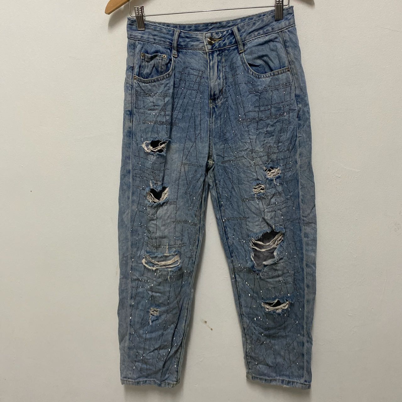 Japanese Brand White Dress Jeans Distressed Denim Size on tag:26 Manual waist size:28 Outseam 35”in Inseam 23.5”in Leg opening 6.5”in Thigh 11.5”in Knee 9”in Front rise 11”in