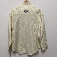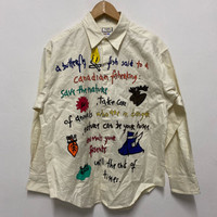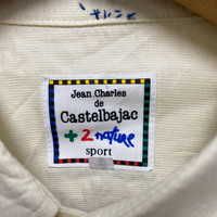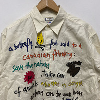 Vintage Jean Charles de Castelbajac Hand-painted cream and yellow shirt with a unique design Chest: 22โ Length: 28โ Shoulder: 19โ Sleeve Length: 21.5โ Sale are final #art #handmade