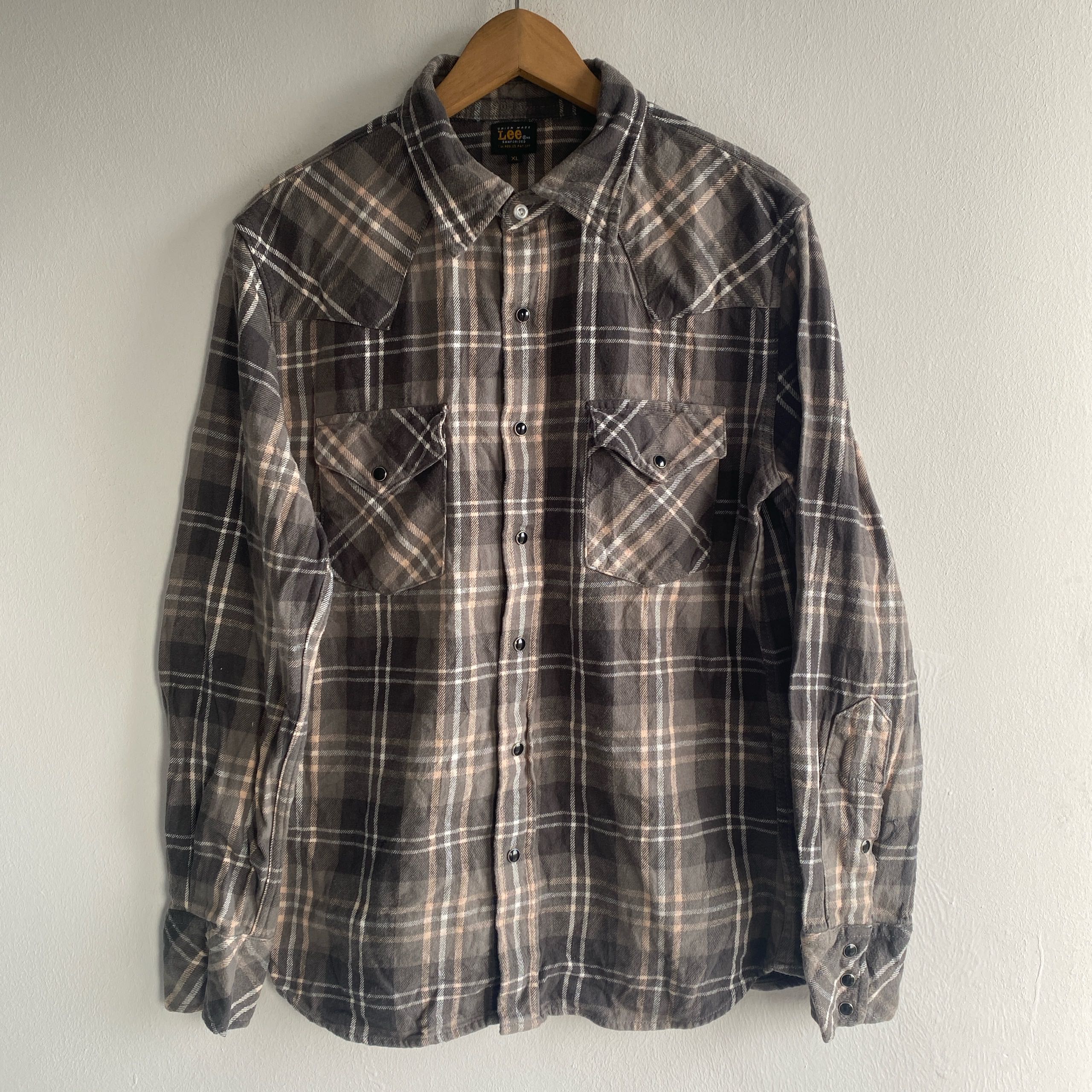 Union Made Lee Sanforized Flannel Western Pearl Button Size on tag: XL, fit to L P2P: 21” Length:28.5” Good condition Sale are final