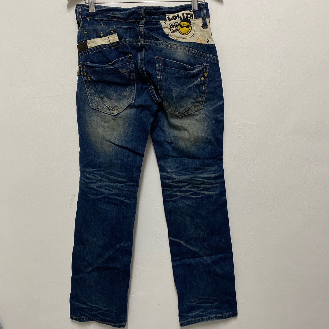Vintage Lolita Jeans Bad Smile Distressed Denim Acid Wash Patches Manual waist size:30” Outseam: 40” Inseam: 31”in Front rise: 8.5”in Thigh:10.5”in Knee: 8” in Opening leg: 8” in Sku: rakdpn #lolita #lolitajeans #japanesebrand #japanesedesigner #designer