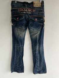 Size on tag: 26 Manual waist size: 26-28 Outseam/ length: 40” Inseam: 32.5” Open leg: 8.5” Front rise:7.5” Back rise: 11” Thigh: 11” Knee: 7” Hips: 18” Good condition 8/10 All sales are final No return. No refund. No exchange Sku:rakdpn