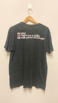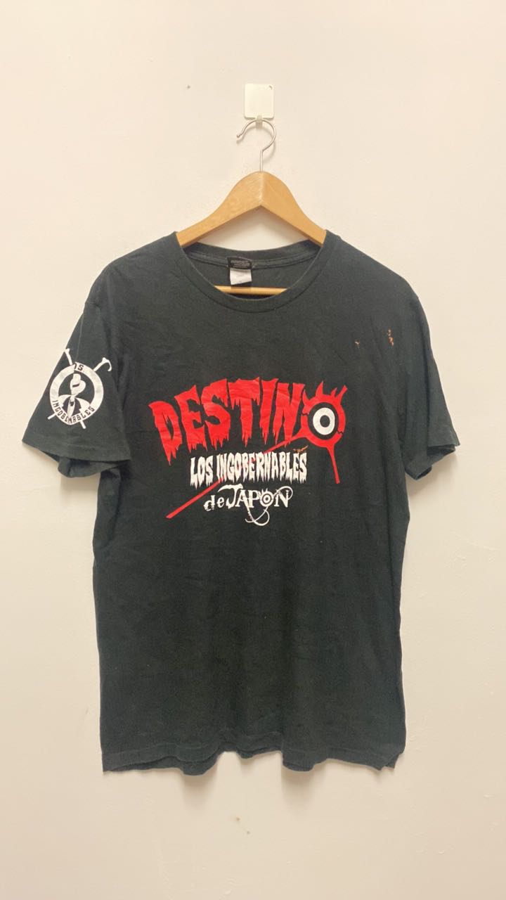 Los Ingobernables de Japon Destino Wrestling T-Shirt NJPW Black Large Description: • Brand: New Japan Pro Wrestling (NJPW) • Size: Large • Color: Black • Front Design: “Destino” in bold red letters with the faction name “Los Ingobernables de Japon” in white. • Back Design: Spanish phrase “¡Mira! Guiados por el destino, Llegar al futuro incontrolable” with an hourglass graphic. • Sleeve Print: Los Ingobernables logo. • Material: Likely cotton blend. • Condition: Check for wear, fading, or small holes (as visible in the image). Knowledge: • Los Ingobernables de Japon (LIJ) is a famous wrestling faction in NJPW, founded by Tetsuya Naito. • “Destino” refers to Naito’s finishing move, emphasizing the group’s rebellious and ungovernable nature. • NJPW merchandise, especially faction-related shirts, is highly collectible among Chest: 21” Length:28” Sale are final