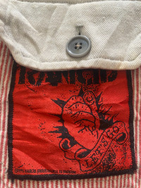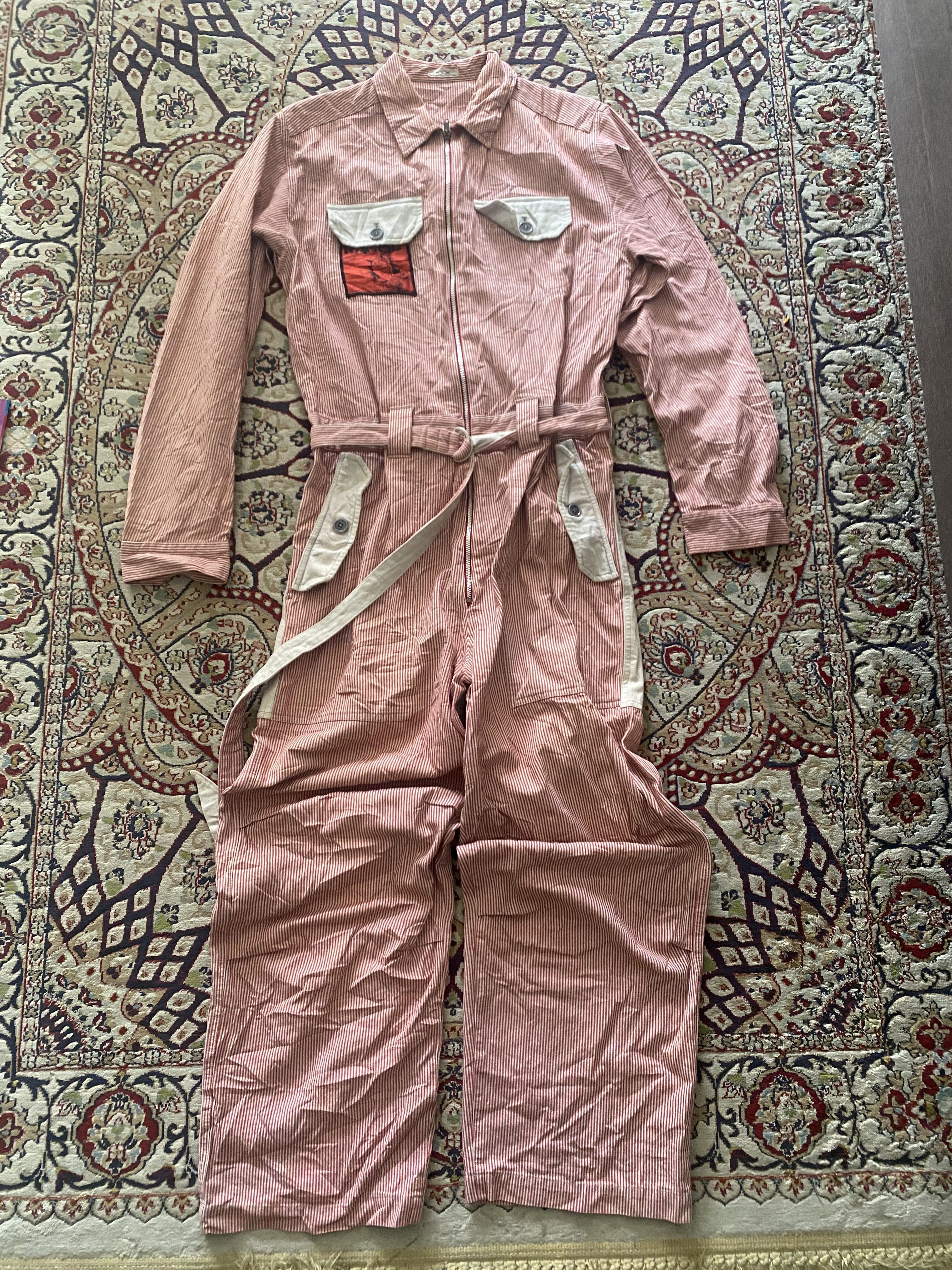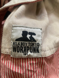 Milkboy Tokyo Workpunk 181 Coverall Jumpsuit Red White Striped Vintage Rare Rare and unique Milkboy Tokyo Workpunk 181 coverall jumpsuit in red and white stripes. Features a punk-inspired patch on the chest, contrast buttoned pockets, and a belted waist for an adjustable fit. The back has a distinctive two-tone design with a cream-colored lower panel. A collectible piece for Milkboy and Japanese streetwear enthusiasts. Milkboy Tokyo is a Japanese fashion brand known for its punk, gothic, and avant-garde designs. The “Workpunk” line blends industrial and workwear aesthetics with a rebellious punk edge, making it sought after among collectors and vintage fashion lovers. Milkboy Tokyo, Workpunk 181, Vintage Jumpsuit, Coverall, Japanese Streetwear, Rare Fashion, Red White Striped, Punk Workwear, Avant-Garde, Designer Jumpsuit